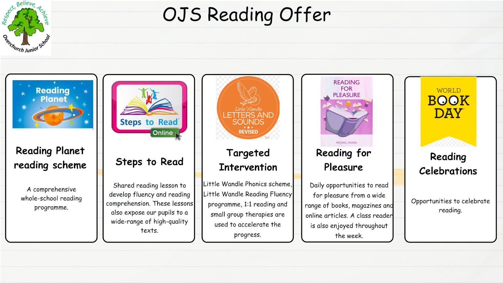 At Overchurch Junior School, we use Ready Steady Read Together (formerly Steps to Read) for the teaching of reading. These lessons are whole class, shared reading sessions that teach reading comprehension skills and strategies explicitly.